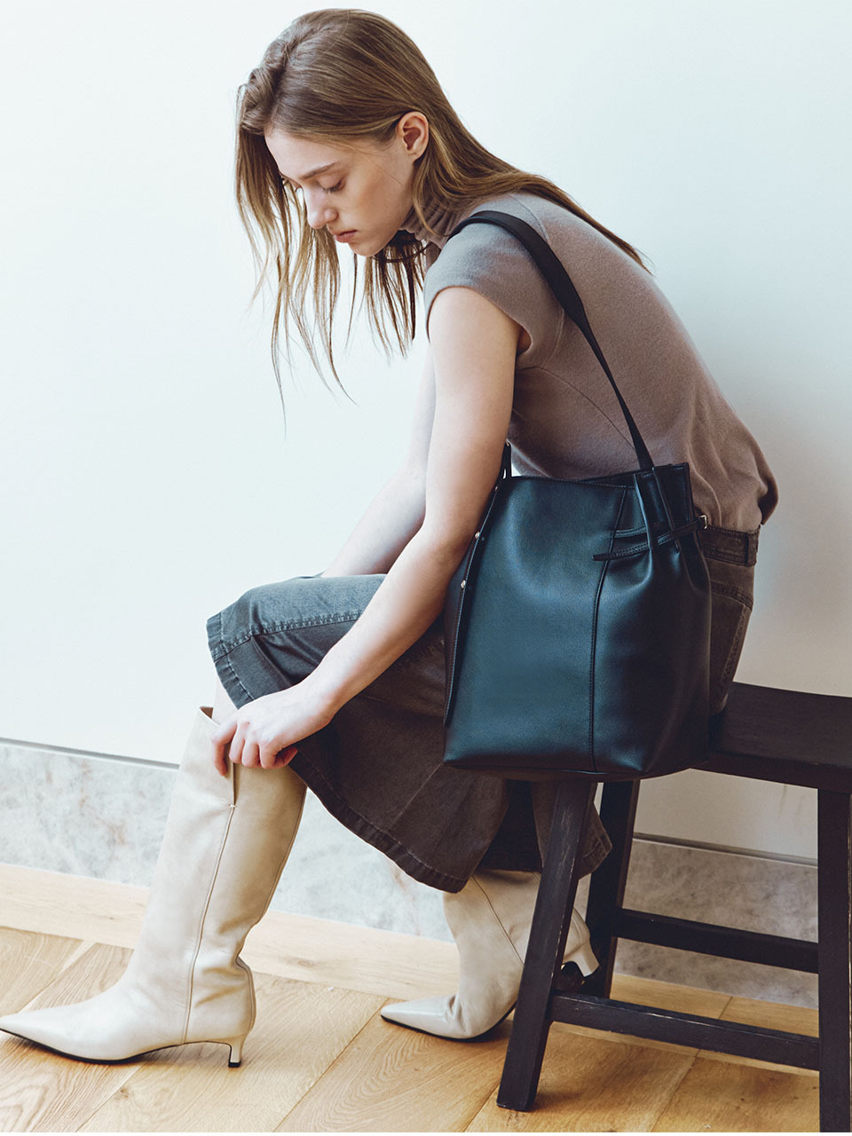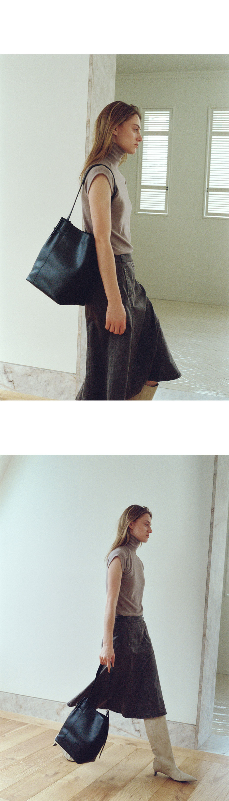 가늘고 긴 벨트스트랩을 콤비하여 섬세함을 더하였으며 부드럽고 자연스러운 광택감이 돋보이는 소재의 볼륨감 있는 바디가 고급스러운 느낌을 줍니다.